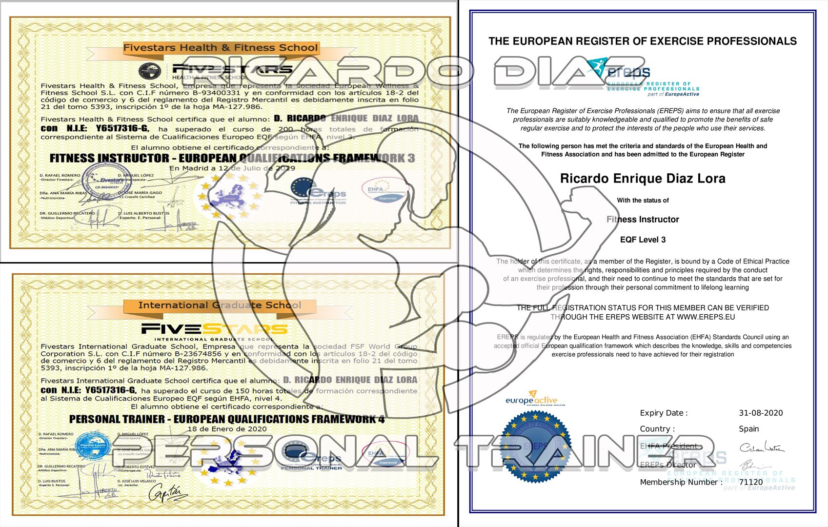 Perfil Entrenamiento en suspensión TRX (Federación Española de Aerobic y Fitness F.E.D.A) Barcelona – España. Personal Trainer (FiveStars International graduate School) Bruselas – Belgica / Madrid – España. Niveles EQF3 – EQF4 Comparte esto: Haz clic para compartir en X (Se abre en una ventana nueva) X Haz clic para compartir en Facebook (Se abre en una ventana nueva) Facebook Me gusta Cargando...